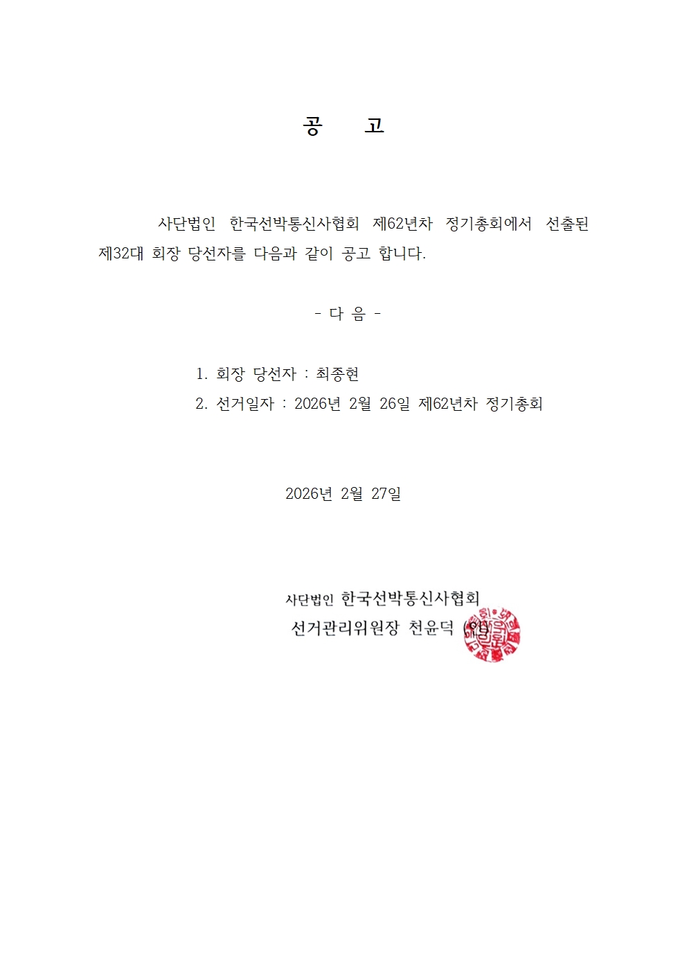 제62년차 정기총회 제32대 회장 당선자 공고
